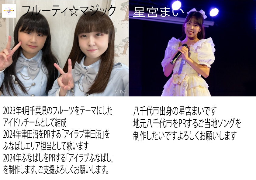 私達は、2024年4月~立ち上ったプロジェクトチームで、歌とアーティストの力で千葉県54市町村をPRしています。このプロジェクトを推進するのはアイドル&シンガーたちです。彼女たちは歌とパフォーマンスで多くの方を元気にする活動をしており、その魅力とパワーをもっと社会のために役立てたいという気持ちから「社会貢献型」というテーマを元に活動を始めました。2024年4月~スタートし、すでに10市町まで広がりました。私共の活動は、このプロジェクトに共感してくださる方からのクラウドファンディングのご支援によって実現しています。